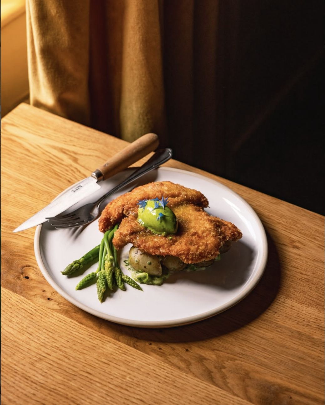 Chicken schnitzel with wild English asparagus, jersey royals and parsley butter.